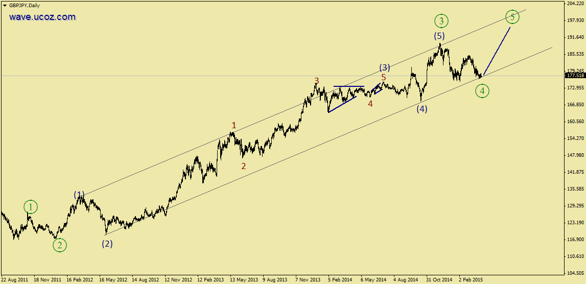 2015 | Кросс курсыПрогулялся по валютным парам и обнаружил интересную ситуацию на фунтойене. Эта пара в хорошем восходящем тренде и сейчас идёт коррекция. Самое время подумать, подготовится и отыграть следующую волну. Перспективы хорошие, около 2000 пунктов. Но! Коррекция еще не закончилась, нужно дождаться первые признаки начала восхождения.